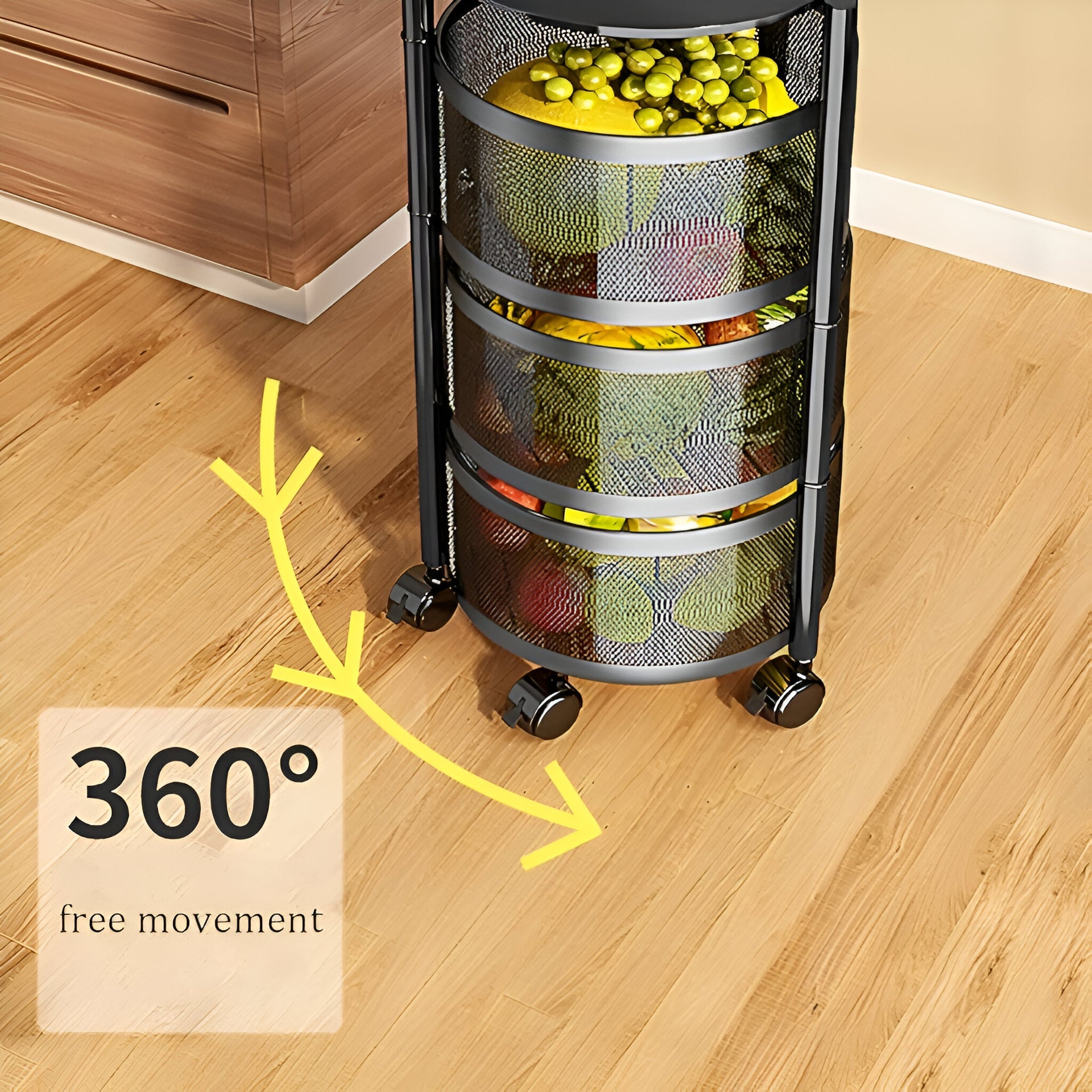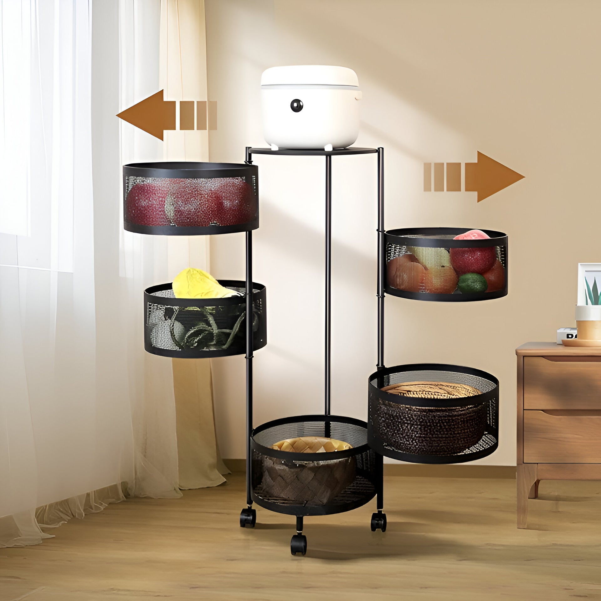 - Transforma la organización de tu cocina con este estante de 5 niveles, que incluye cestas giratorias para facilitar el acceso a tus frutas y verduras, condimentos, alimentos o diversos artículos que desee organizar.
