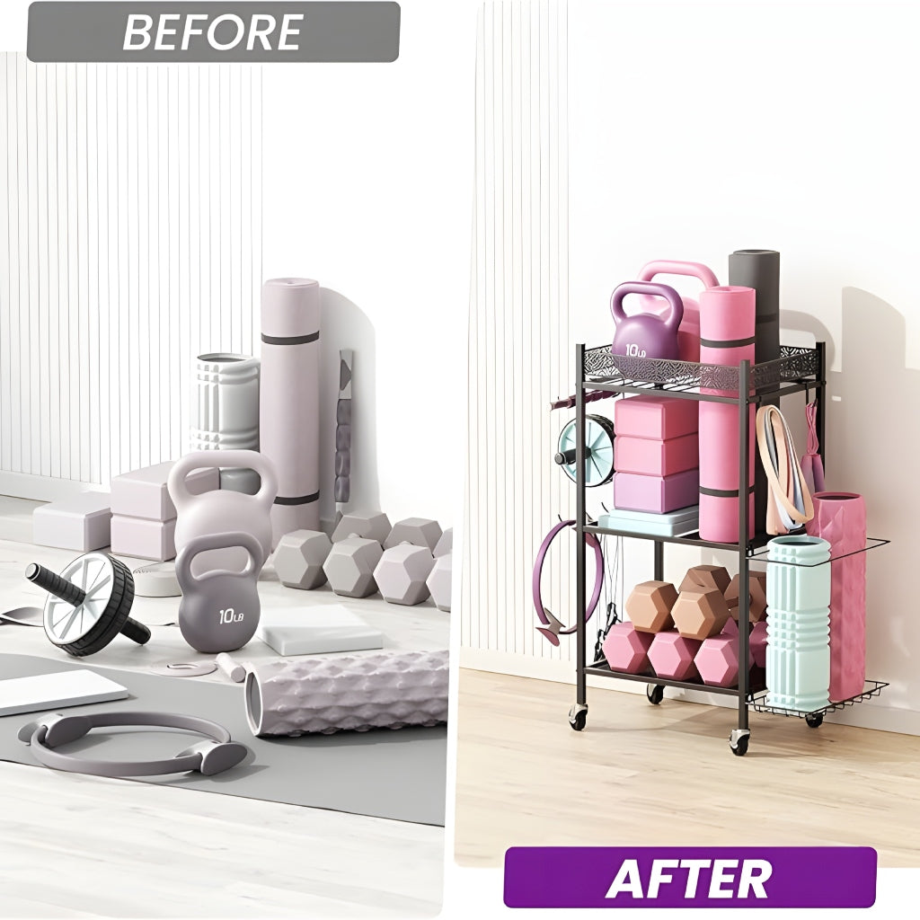 - Ideal para gimnasios en casa, estudios de yoga, cocheras o espacios reducidos, este organizador combina funcionalidad y estética para transformar tu rincón fitness en un entorno ordenado y motivador.